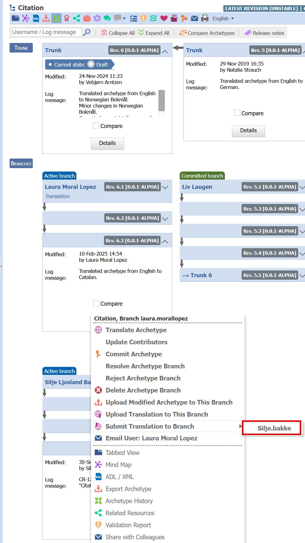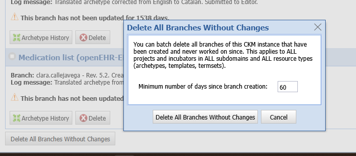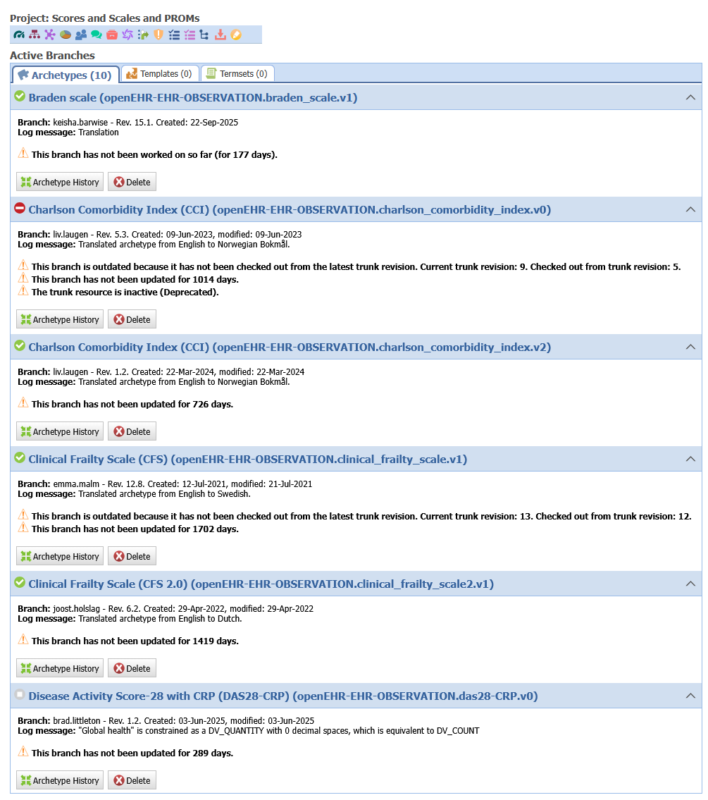 This problem exists not only for active translation branches, but active branches in general. For example this branch in CLUSTER.service_direction.v1 with a few added elements, is active since 2022: https://ckm.openehr.org/ckm/archetypes/1013.1.3181/revisionhistory. As long as this is not resolved, adding translations is not possible. I just feel like it is quite messy and it’s worth having a discussion for potential solutions.