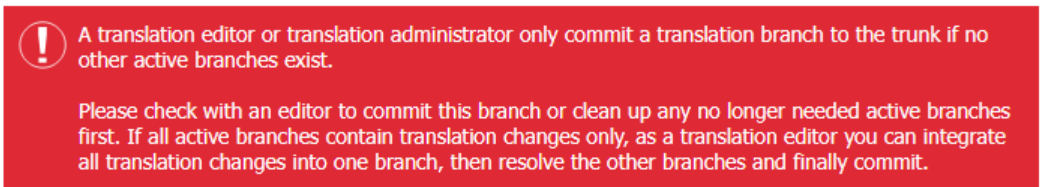 Can this behaviour be changed? Sure - we can let translation admins commit even when there are other active branches…but that will leave editors with the problem of having to deal with the remaining - now outdated - active branch(es). If @siljelb and the other editors believe that is a better process, I am happy to relax the check accordingly. Personally, I believe this is just creating an extra burden for the editors.
