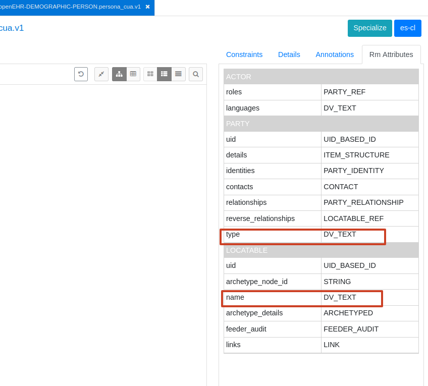 In the demographic RM ACTOR.type(): DV_TEXT is a method, though in the AD it can be added to a PERSON and even constrained, though it thinks it’s a DV_TEXT.