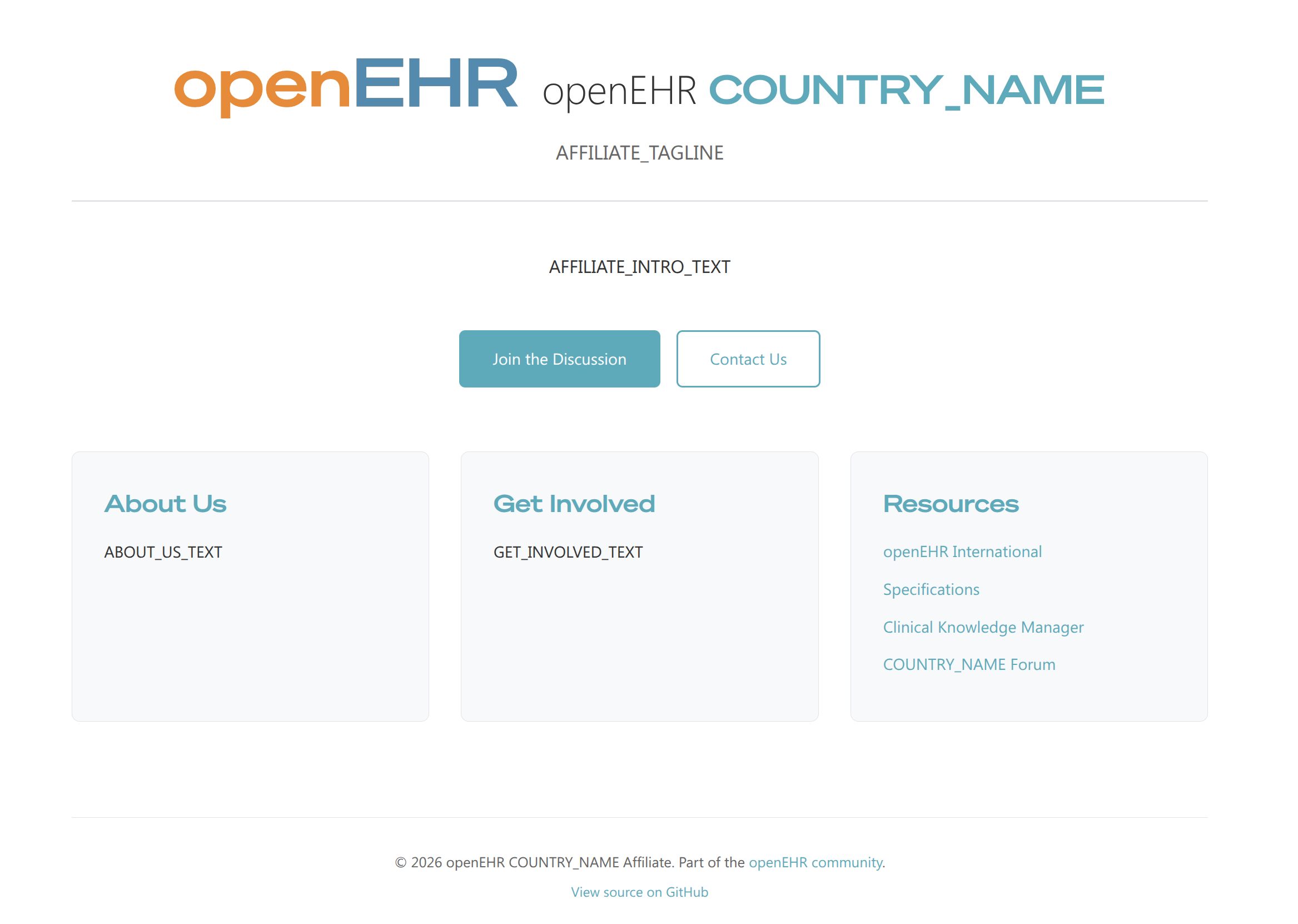 The template is a single-page design with clean HTML and CSS, using the official openEHR Soehne Breit font and branding. It’s inspired by the nice simple sites we’ve seen from openehr.lu and openehr.ch. All you need to do is find-and-replace a handful of placeholders (like COUNTRY_NAME, COUNTRY_CODE, etc.) in VS Code and you’re done. No build process, no dependencies - just plain HTML and CSS files you can upload anywhere.