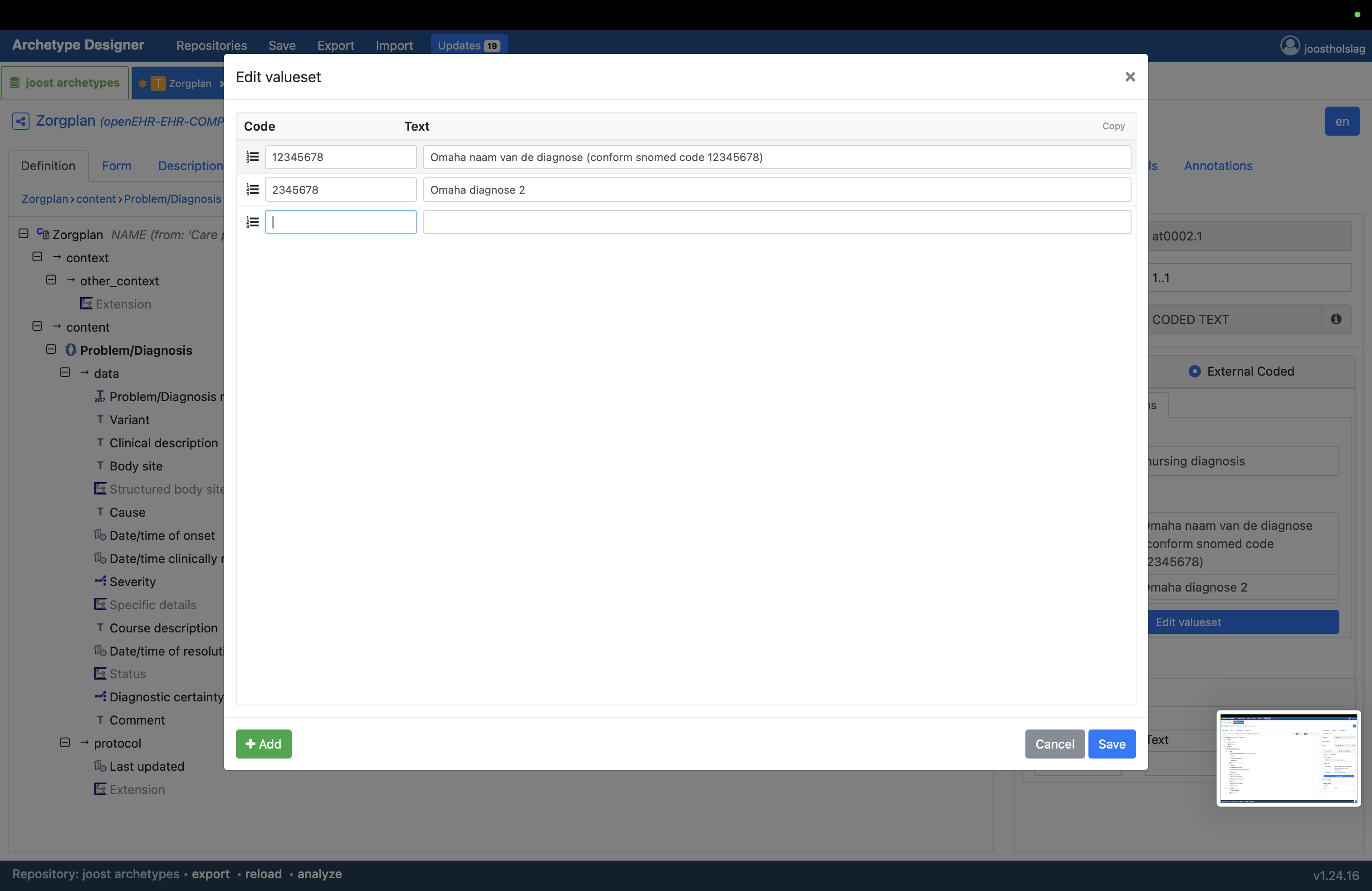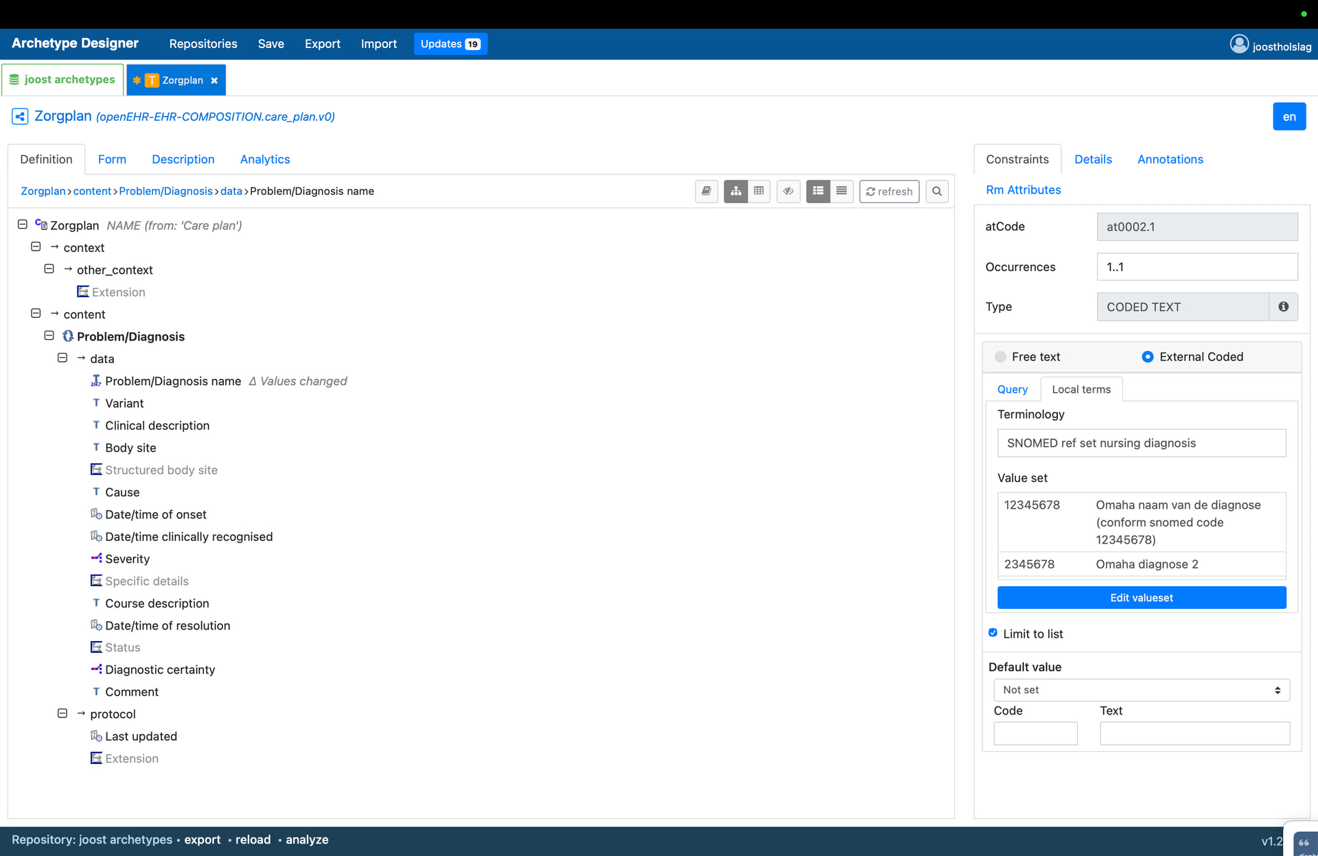 For a project about SNOMED CT coding of nursing diagnoses I’m creating a template with a set of diagnoses names with corresponding SNOMED codes. For each diagnosis name the user records, a corresponding SNOMED code should be persisted.