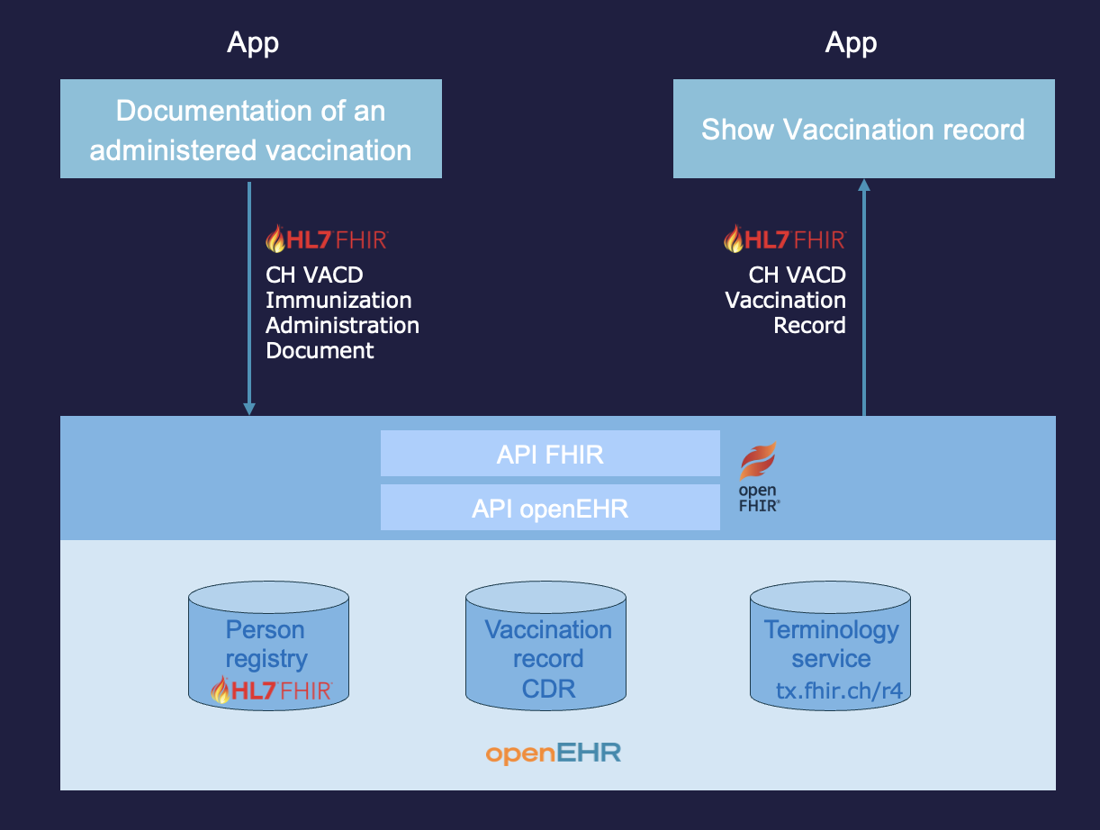 In Switzerland, vaccination data exchange is based on FHIR, using the CH VACD implementation guide. For this showcase, we would like to demonstrate an architecture in which vaccination data are submitted as CH VACD FHIR documents, persisted as structured clinical data in an openEHR CDR, and later returned in CH VACD-compliant FHIR format.